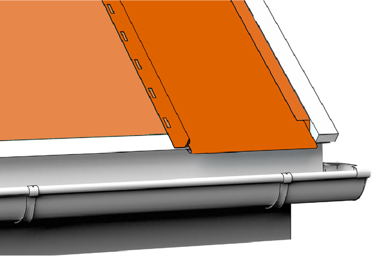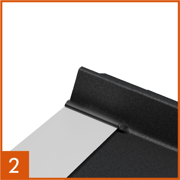 1. Fissa la prima lastra Fibrograf al supporto. Incastra la lastra Fibrograf alla gronda di avviamento tramite la piega di ancoraggio, utilizzando un martello di gomma, ed assicurandoti di lasciare uno spazio di dilatazione di 10-15 mm. Fissa poi la lastra al supporto sottostante tramite la banda pre forata.