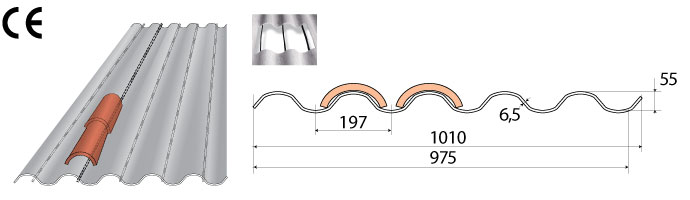 Lastre ondulate rinforzate profilo 101 passo 197/55 – SOTTOCOPPO (5 onde): dalla ricerca e dalla sperimentazione Fibrotubi, nasce Il sottocoppo GEA. Le lastre sottocoppo assicurano il risparmio sulla posa dei coppi, inoltre possono essere utilizzate direttamente a vista. Il profilo è conforme alla maggior parte delle tipologie di coppo, si adatta ad ogni esigenza progettuale e può essere impiegato per la copertura di nuovi edifici o per risanare coperture di costruzioni esistenti adibite ai più svariati usi (civile, agricolo, industriale).